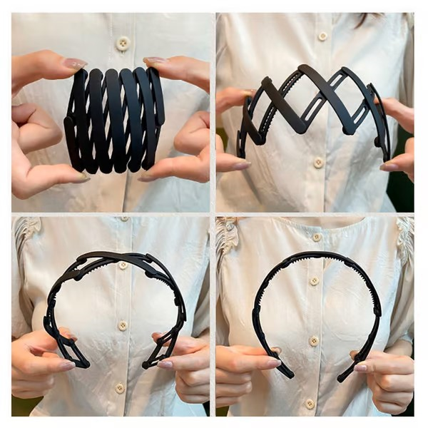 Our new headband is stretchable and can be adjusted to bend according to your head circumference. Just hold it firmly in your hands and gently press it inward to move the hinge to fold it into a compact size. When ready to use, pull them to expand to the maximum condition and wear them.